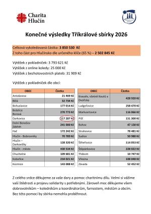 V letošní Tříkrálové sbírce se vybralo celkem 3 793 621 Kč z pokladniček, 25 000 Kč z online koledy a 31 909 Kč z bezhotovostních plateb. Děkujeme všem dárcům, dobrovolníkům a organizátorům za jejich významnou podporu. Bez této pomoci by sbírka nemohla proběhnout.