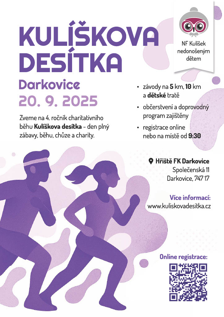 Dne 20. září 2025 se na hřišti FK Darkovice koná 4. ročník charitativního běhu Kulíškova desítka. Akce slibuje den plný zábavy, sportu a charity, včetně závodů na 5 km a 10 km, a dětských tratí. Registrace je možná online nebo na místě od 9:30, a k dispozici bude také občerstvení pro všechny účastníky. Registrace na www.kuliskovadesitka.cz