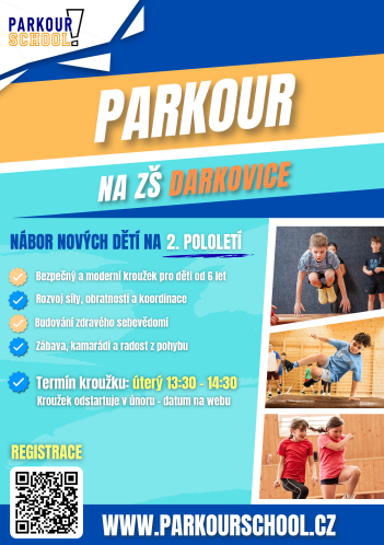 ZŠ oznamuje zahájení náboru nových členů do kroužku parkouru. Kroužek je určen pro mladé sportovce ve věku od 6 do 16 let a zaměřuje se na bezpečné a moderní tréninkové metody. Kroužek začne v únoru a setkání se budou konat každé úterý od 13:30. Zájemci se mohou hlásit prostřednictvím registračního formuláře na webových stránkách. Těšíme se na všechny nové tváře a budeme rádi, pokud se k nám přidáte.