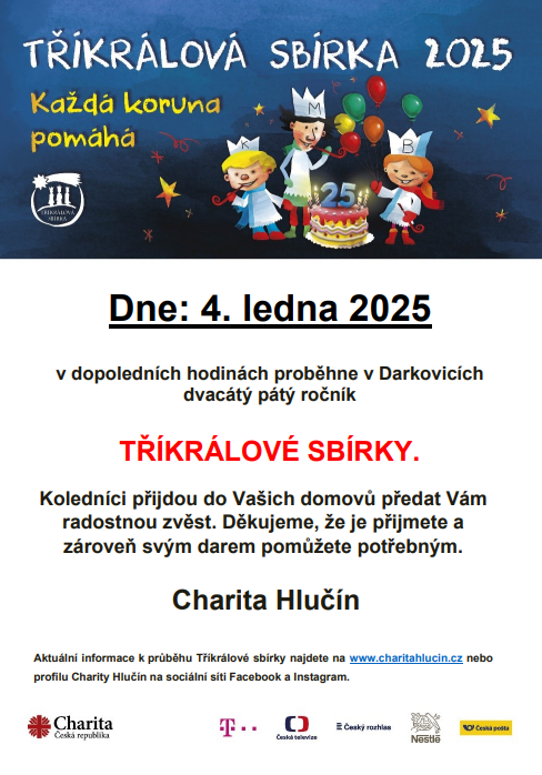 Dne 4. ledna 2025 se v Darkovicích v dopoledních hodinách uskuteční dvacátý pátý ročník Tříkrálové sbírky. Koledníci navštíví domovy místních obyvatel, aby přinesli radostnou zvěst a vybrali dary na pomoc potřebným. Organizátoři z Charity Hlučín děkují všem, kteří koledníky přijmou a podpoří sbírku svým příspěvkem. Pro aktuální informace o průběhu sbírky můžete navštívit webové stránky Charity Hlučín nebo jejich profily na Facebooku a Instagramu.
