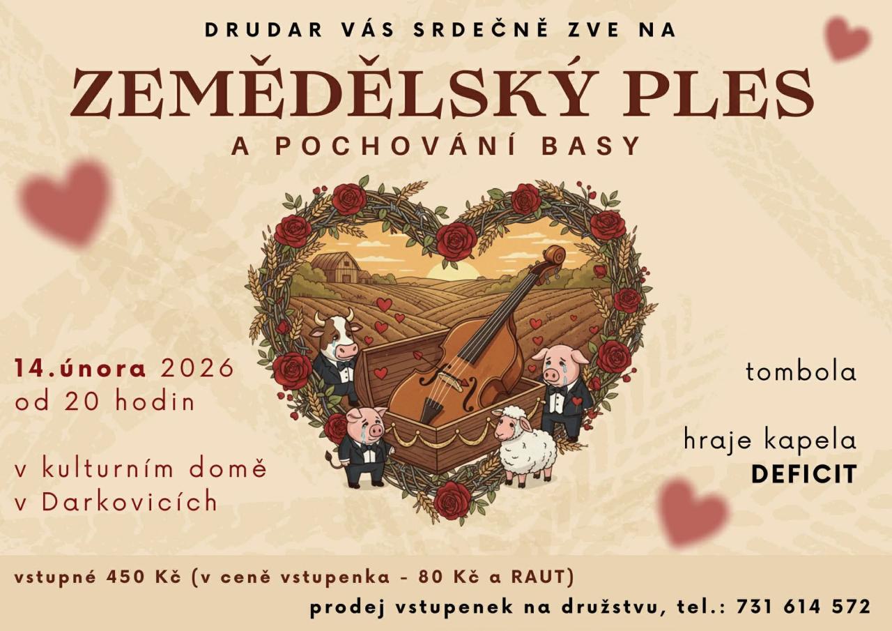 Pozvánka na zemědělský ples Drudar a pochováním basy. Vstupné 450,- (v ceně vstupenka a raut)