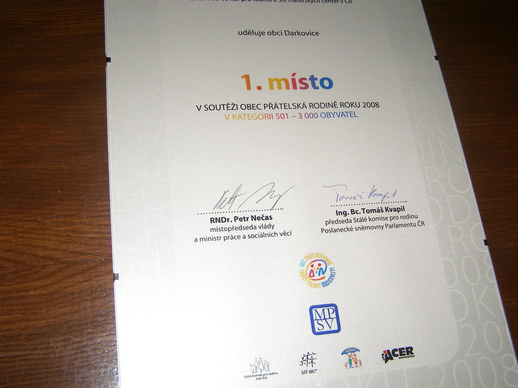 V soutěži Obec přátelská rodině, kterou v květnu vyhlásilo Ministerstvo práce a sociálních věcí České republiky (MPSV ČR), v kategorii obcí 500-3 000 obyvatel zvítězila naše obec Darkovice. Do finálového boje jsme postoupili ještě se dvěma soupeři z 83 v dané kategorii, celkově se do soutěže přihlásilo 216 měst a obcí z celé republiky.